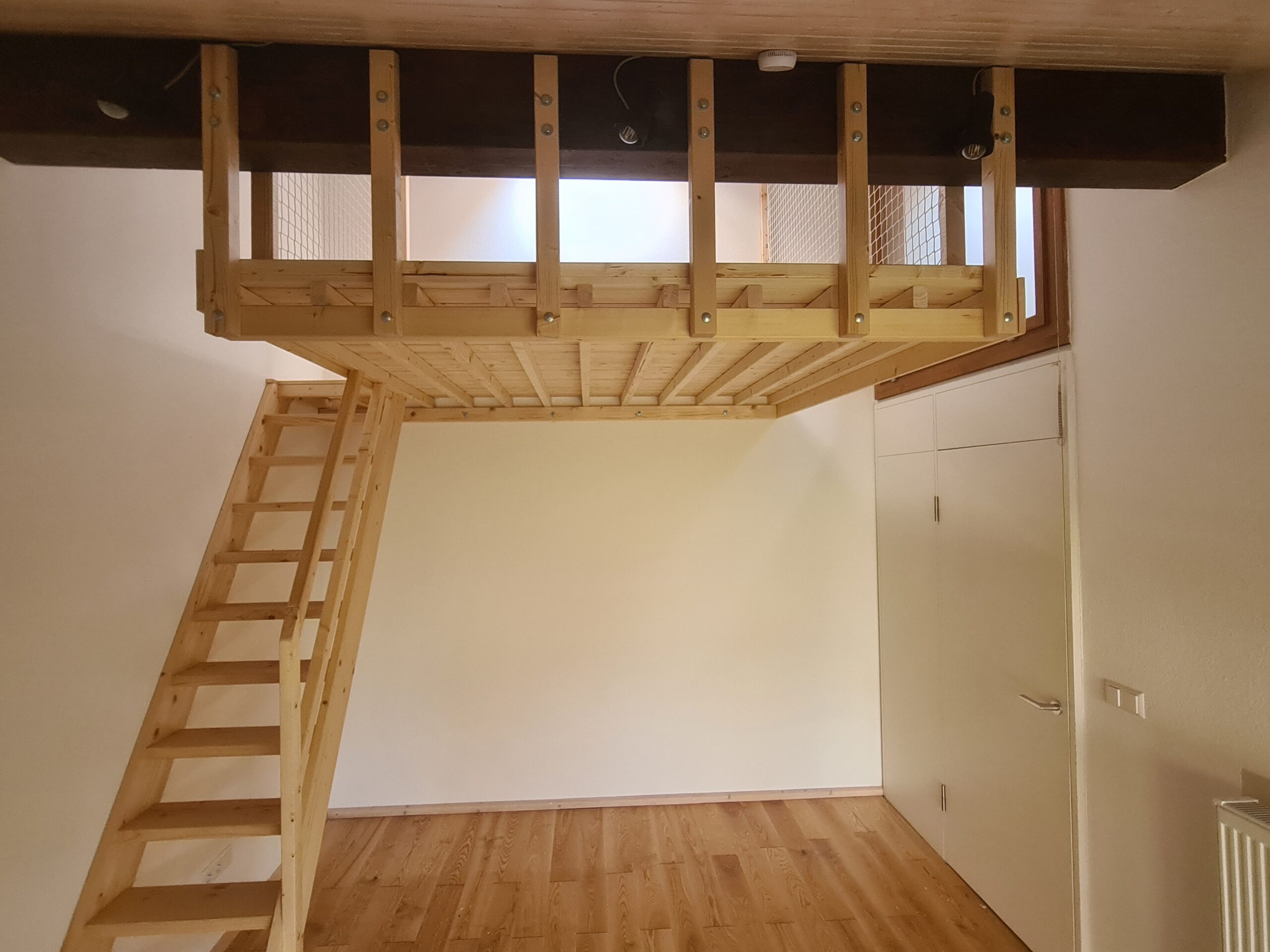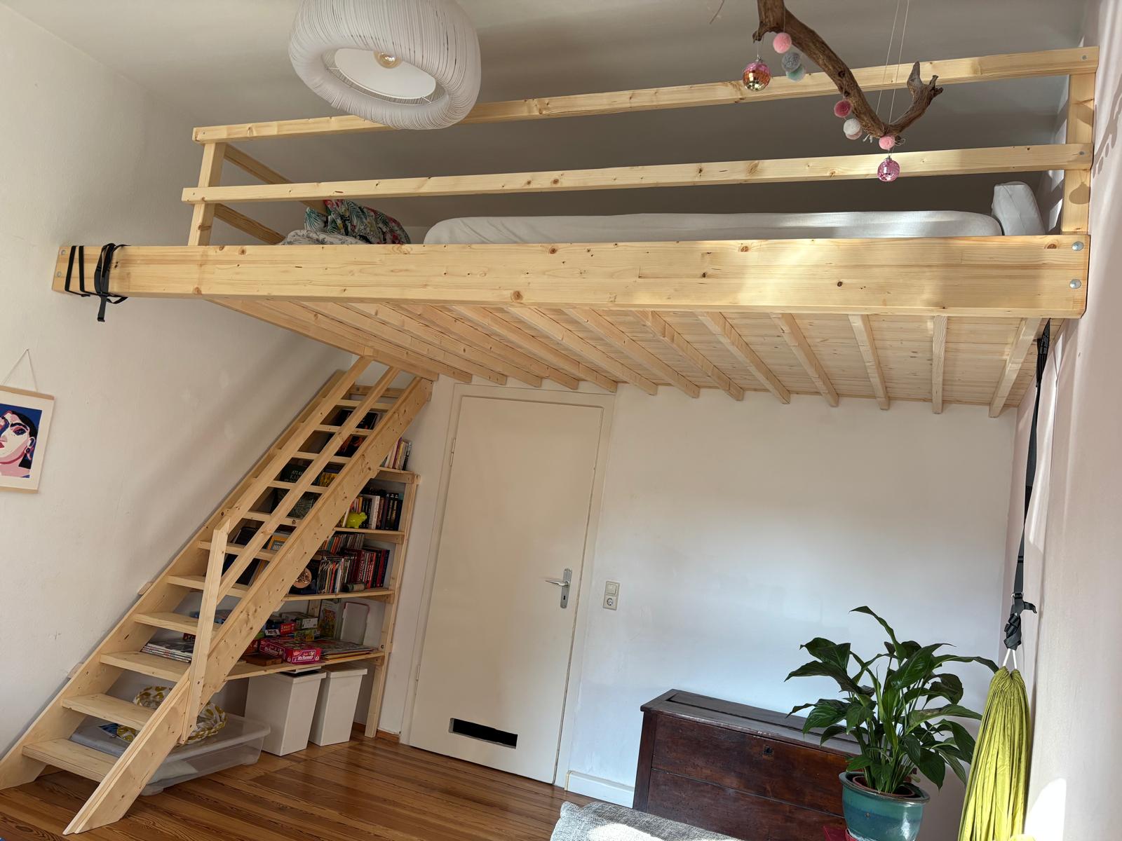 8 m² Schlaffläche, Fichtenholz, integrierte Treppe mit Regalen, einfaches Holzgeländer. Deckenhöhe: 310 cm. Gesamtpreis: 5.900 € inkl. Planung und Montage.
