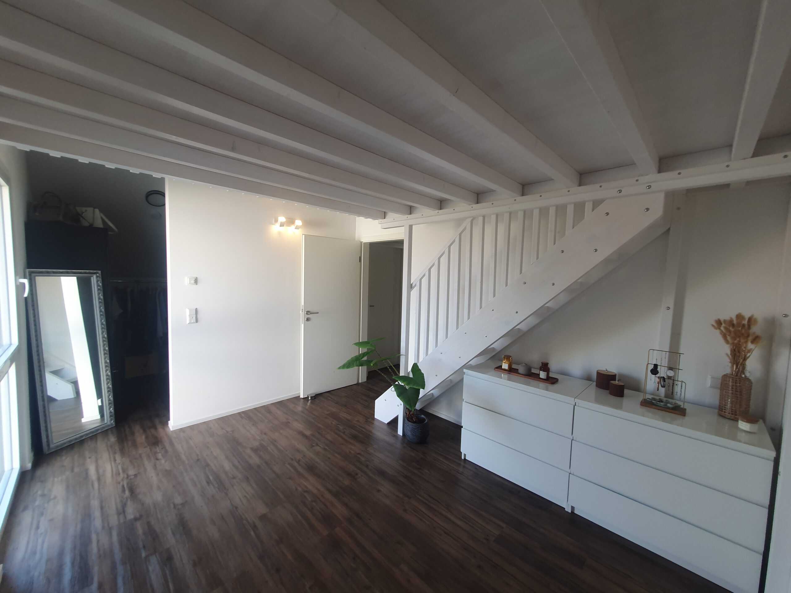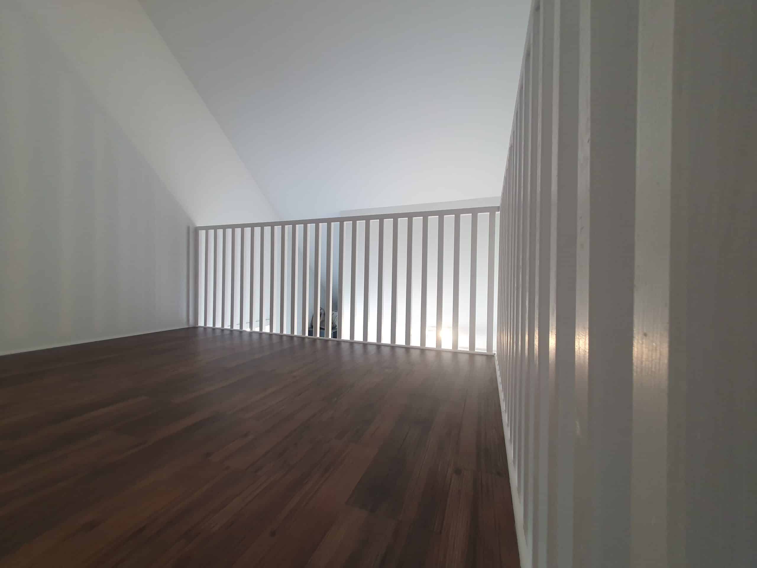 Die weiße Konstruktion mit sicherem Geländer und bequemer Treppe sorgt heute für deutlich mehr Ordnung, mehr Bewegungsfreiheit und ein offenes Raumgefühl.